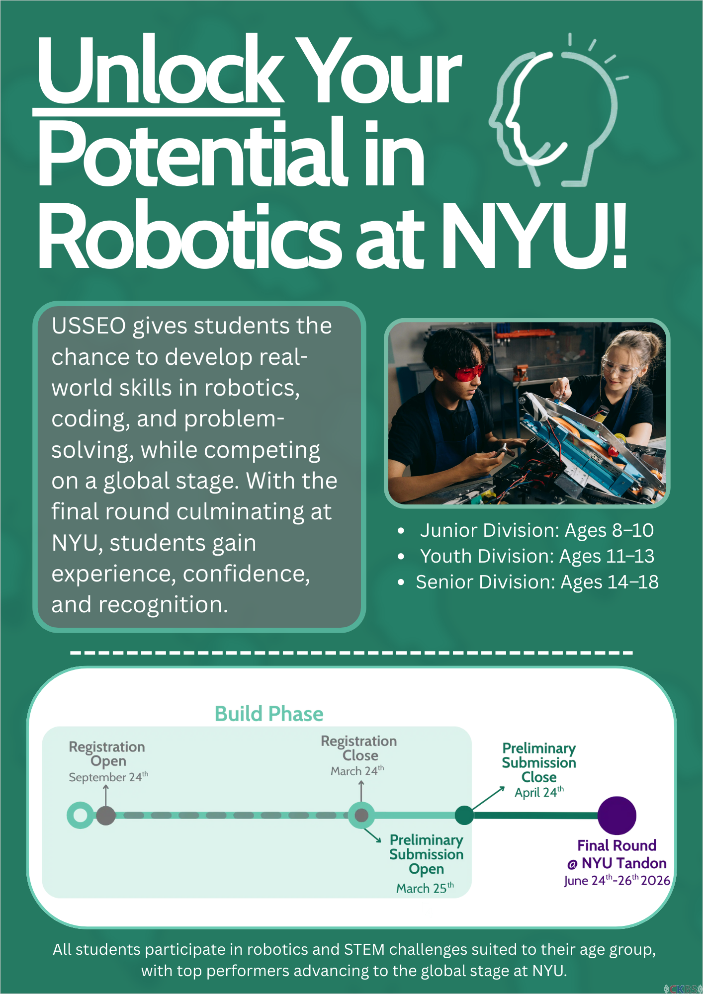 The USSEO Robotics Challenge at NYU Tandon introduces student innovators to the impact of engineering, creativity, robotics, and AI in solving real-world challenges. Students design, build, and test a single robot based on the year’s theme, gaining hands-on experience in mechanical design, teamwork, and structured problem-solving. Schools may register multiple teams, though each student may join only one team and each team may submit one robot. The challenge includes a virtual preliminary round and an in-person final at the NYU Tandon School of Engineering, where top teams present their robots, compete for awards, and receive recognition for their work.
